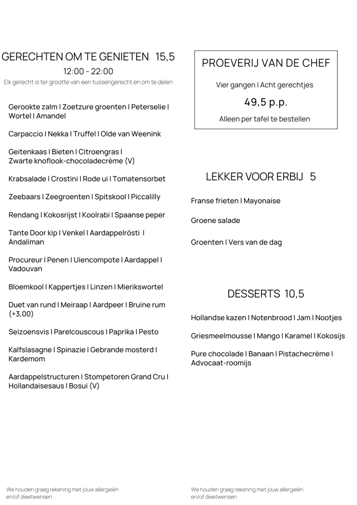 Op onze menukaart staan mooie gerechten die allemaal de grootte van een tussengerecht hebben. De gerechten worden bereid met ingrediënten uit de regio en het seizoen. Ook vind je meer dan 15 open wijnen, goede bieren en lekkere cocktails op de kaart!